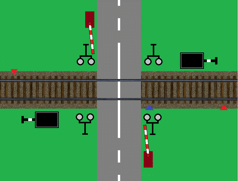 Pero, por si no os ha quedado claro, aquí va una animación de cómo funciona un paso a nivel. Los triángulos rojos y el azul son los pedales de detección y el de rearme. Cuando se ponen de color amarillo quiere decir que está detectando al tren. Tened en cuenta que es una representación esquemática y no real al 100% (y que la hice en el año 2012 con unos medios muy precarios, no me lo tengáis en cuenta).