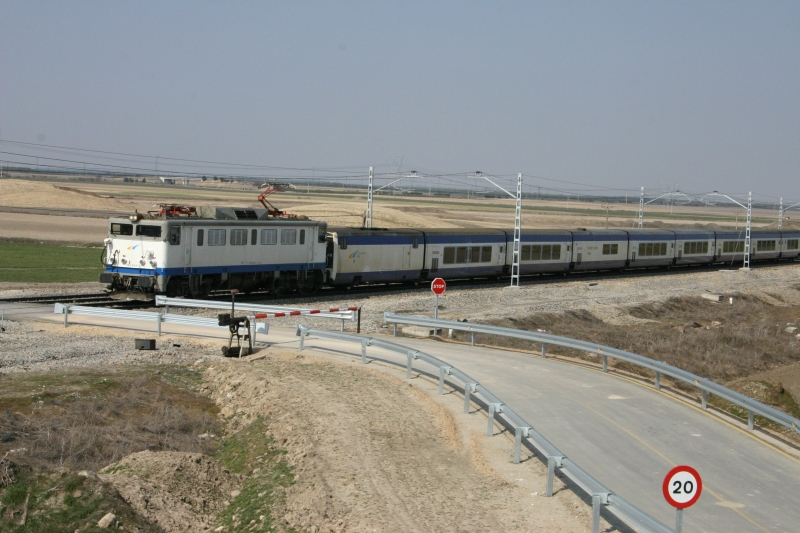 Paso a nivel Clase A3. Al lado, un PN peatonal. Se trata del ya desaparecido PN de El Pinar de Antequera (Valladolid). La vía por la que circula la unidad es de ancho ibérico y la otra es la LAV de Valladolid (ancho UIC). Foto: Yago López Carvajal, febrero 2008.