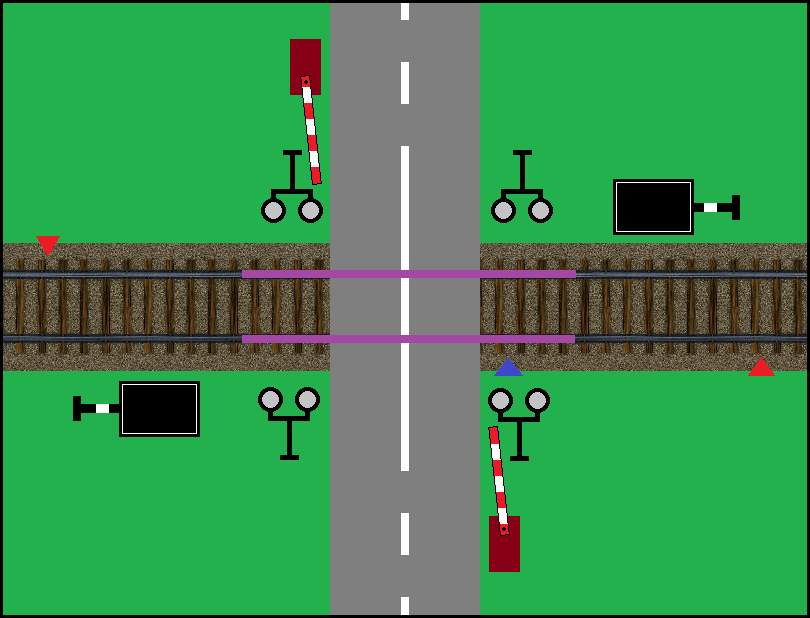En el esquema vemos todo el equipo completo de un PN de clase A3. Los triángulos rojos son pedales de aviso direccionales. Después tenemos la SFPN. Las líneas moradas son el circuito isla. También tenemos la protección de la carreteta, que en este caso son las semibarreras y los semáforos (y su sonería) y por último el triángulo azul es el pedal de rearme.