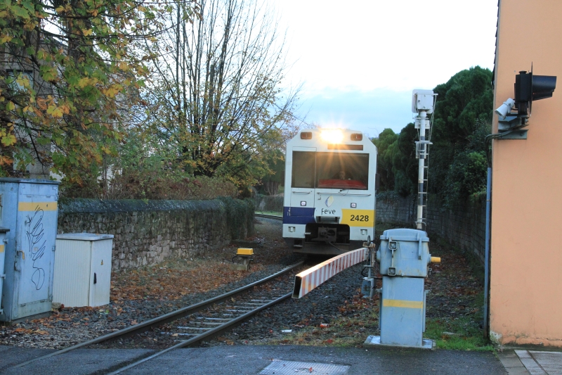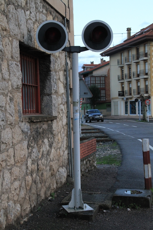 Todo el conjunto completo. Semáforo (adosado a la pared rosa), sonería (adosada al semáforo), semibarrera cerrada, señal ferroviaria de paso a nivel (la vemos de espaldas), circuito de vía del PN (la caja amarilla a la izquierda de la vía) y un tren de la antigua FEVE pasando por el PN de Cabezón de la Sal (Santander). Foto: Yago López Carvajal, diciembre 2012.