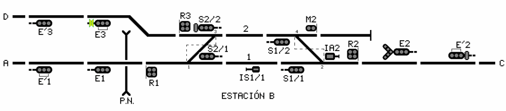 Vamos a poner un ejemplo. Tenemos nuestra ya muy conocida estación “B” en la cual hay un paso a nivel entre las señales de entrada E1 y la de retroceso R1.